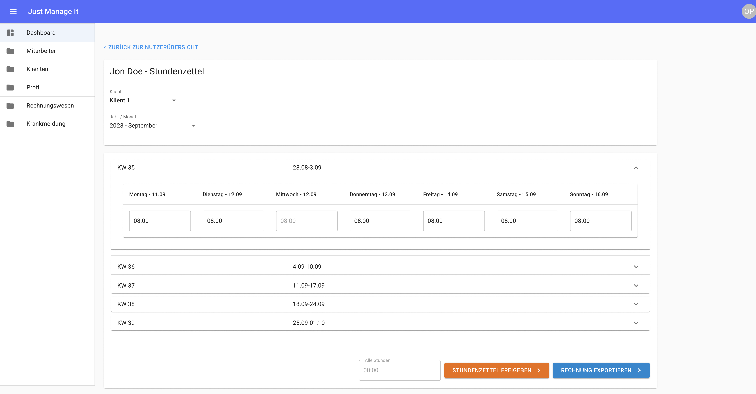 Unsere Software, JustManageIT, bietet ein zentrales Dashboard zur Verwaltung von Klienten oder Schulbegleitung. Klienten haben ihren eigenen Kalender für Aufgaben und Stunden, und die Stundenerfassung ermöglicht schnelle Abrechnungen. Krankmeldungen und Rechnungswesen werden effizient verwaltet. Im Profilbereich können Sie Leitungen hinzufügen die Aufgaben erstellen und Stundenzettel einsehen können.